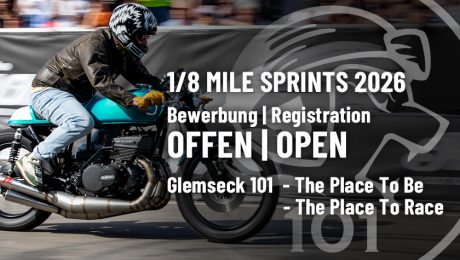 Auf der Glemseck 101 1/8 Meile treten hauptsächlich umgebaute Custom-Motorräder gegeneinander an: »Old School Street Style«. Dies begründet sich aus unserer Geschichte, die mit den sogenannten Cafe Racer ihren Anfang nahm. Für reine Dragster-Motorräder und den Profi-Sport gibt es die 1/4 Meile auf extra dafür gebauten Drag Strips. Reine Serienmotorräder (mit Ausnahme des Classic-Racer-Sprint) oder Motorräder für oder von der Rennstrecke, werden weder von uns noch unseren Gastsprint-Organisatoren angenommen.